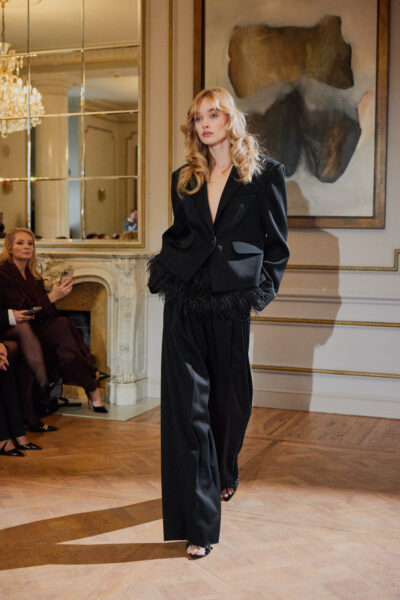 Kolekcja Dawida Wolińskiego na jesień 2025 to przemyślana gra proporcji i faktur, w której siła spotyka się z lekkością. Na wybiegu pojawiły się czarne garnitury o rzeźbiarskich ramionach, ozdobione piórami na krawędziach marynarek, przywodzące na myśl klasykę power dressingu w wydaniu haute couture.