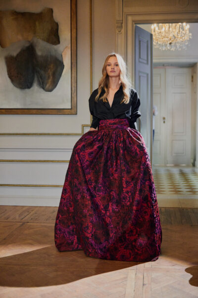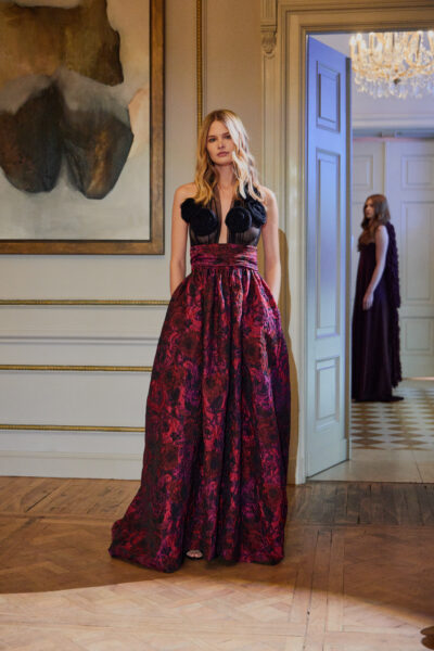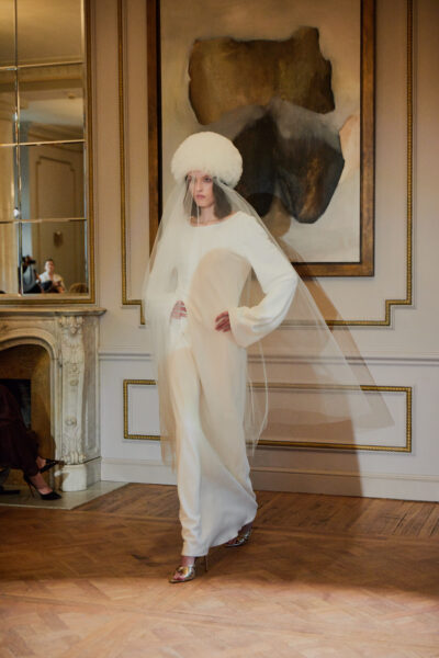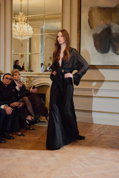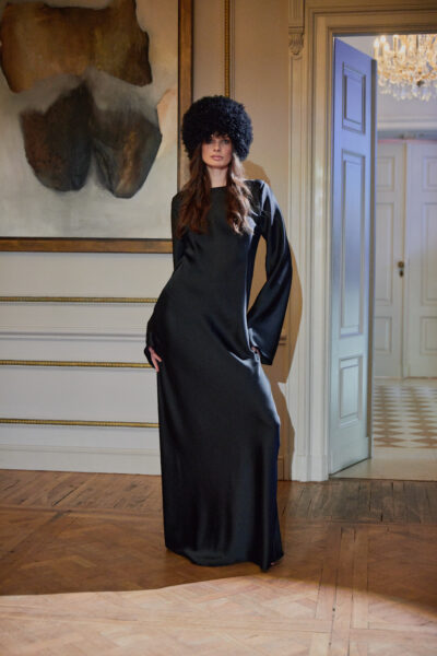 Obok nich płynęły satynowe zestawy w odcieniach śmietankowej bieli, z miękko opadającymi kołnierzami i delikatnym kontrastem lamówki, przypominające szlafroki w stylu old Hollywood. Wśród kreacji dominowały długie, surowe suknie z jedwabiu, których czarne tafle materiału poruszały się jak cień. Z kolei monumentalne płaszcze i suknie balowe z tkanin o fakturze barokowego żakardu — w odcieniach karminu, purpury i burgundu — wprowadzały element dramatyzmu i królewskiego luksusu. Całość dopełniały miękkie czapy z futra i transparentne welony, które nadawały pokazowi mistyczny, niemal teatralny charakter.