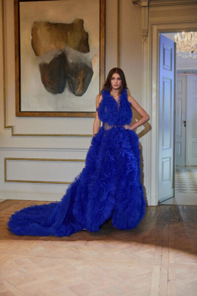 Kulminacją wieczoru była suknia Perlage – wielowarstwowa, wykonana z 70 metrów tiulu, o kształcie przypominającym falę zatrzymaną w ruchu. Jej głęboki, kobaltowy odcień – kolor, który stał się znakiem rozpoznawczym marki Perlage – przywoływał skojarzenia z taflą jeziora w świetle księżyca. Szyta przez ponad 130 godzin, suknia jest nie tylko dziełem rzemiosła, ale też symbolem spotkania dwóch światów: sztuki mody i sztuki życia.