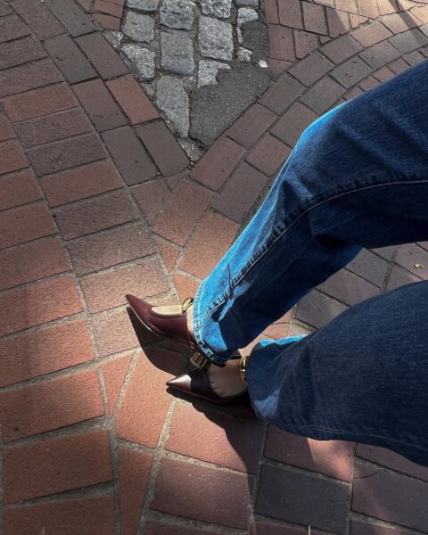 Detal stylizacji z ostrymi czółenkami i prostymi dżinsami pokazuje, że trendy w 2026 roku coraz częściej budują efekt poprzez akcesoria. Wyrazisty nosek butów i metaliczne wykończenie dodają całości charakteru, nawet w bardzo minimalistycznym zestawie.