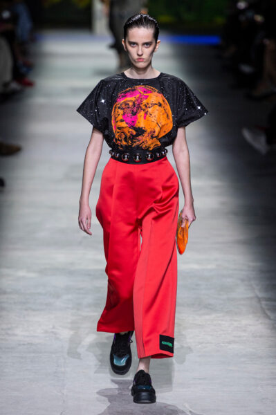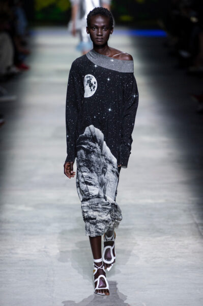 W codziennym stylu trudno mu znaleźć miejsce. Po latach uproszczonych sylwetek i przywiązania do jakości, efektowne nadruki znów wydają się zbyt dosłowne. Kosmiczny print pełni więc inną rolę – jest dekoracją, nie garderobą.