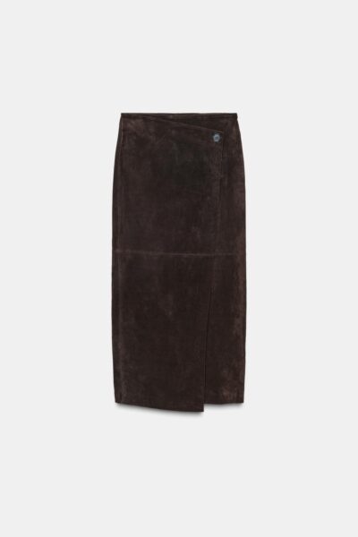 W zestawie z kurtką pojawia się ołówkowa sukienka maxi z zamszu, doskonałe uzupełnienie tej dzikiej elegancji. Z dopasowanym krojem i długością maxi, sukienka doskonale podkreśla sylwetkę, przyciągając uwagę, ale bez przesady. Brązowy zamsz, obecny zarówno w kurtce, jak i sukience, ma w sobie coś z ziemistej klasyki, ale z nutą odrobinę zadziorną. W tej wersji jest w pełni nowoczesny – nieco vintage, ale absolutnie modny. To połączenie dla tych, którzy chcą poczuć się jak gwiazda rodeo, ale z miejskim szykiem na topie.